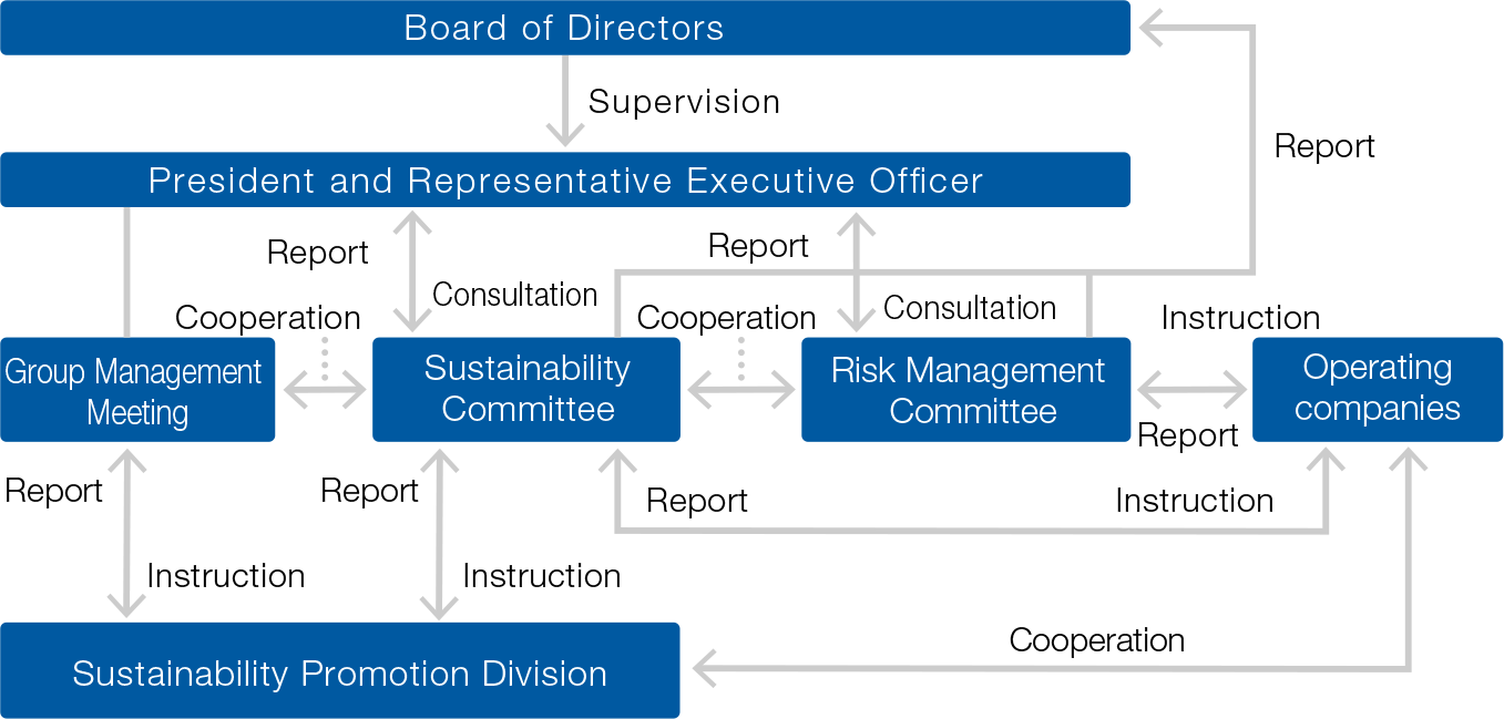 The deliberations of the Risk Management Committee are reported to the Group Management Meeting and shared with the Sustainability Committee. Additionally, the contents of discussions in these bodies, as well as matters approved by the Group Management Meeting, are reported to the Board of Directors (meets monthly). Under this supervisory structure, we reflect risk-related matters in the Group's strategy and implement appropriate measures.