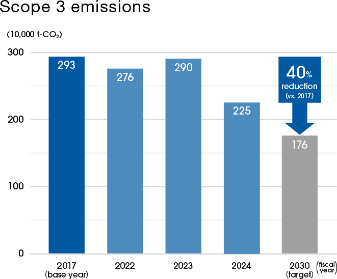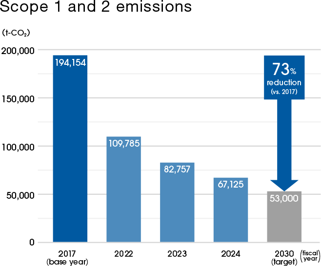 The Company has been calculating its total emissions since fiscal 2017. Our Scope 1 and 2 emissions in FY2024 were 67,125 t-CO2 (65.4% reduction vs. FY2017) and Scope 3 emissions were 2,247,051 t-CO2 (23.2% reduction vs. FY2017). In addition, the ratio of renewable energy was 67.2%.