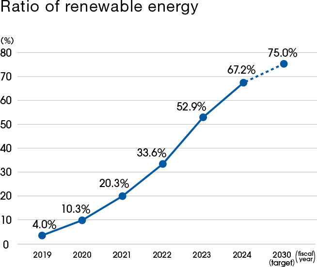 To achieve these long-term targets, the Company started procuring renewable energy-sourced electricity for its own facilities in fiscal 2019, and in October 2020 we joined RE100*, which aims to achieve a 100% renewable energy share for electricity used in business activities by fiscal 2050. Moreover, as an interim target, we aim to achieve a 60% renewable energy share for electricity used in business activities by fiscal 2030.