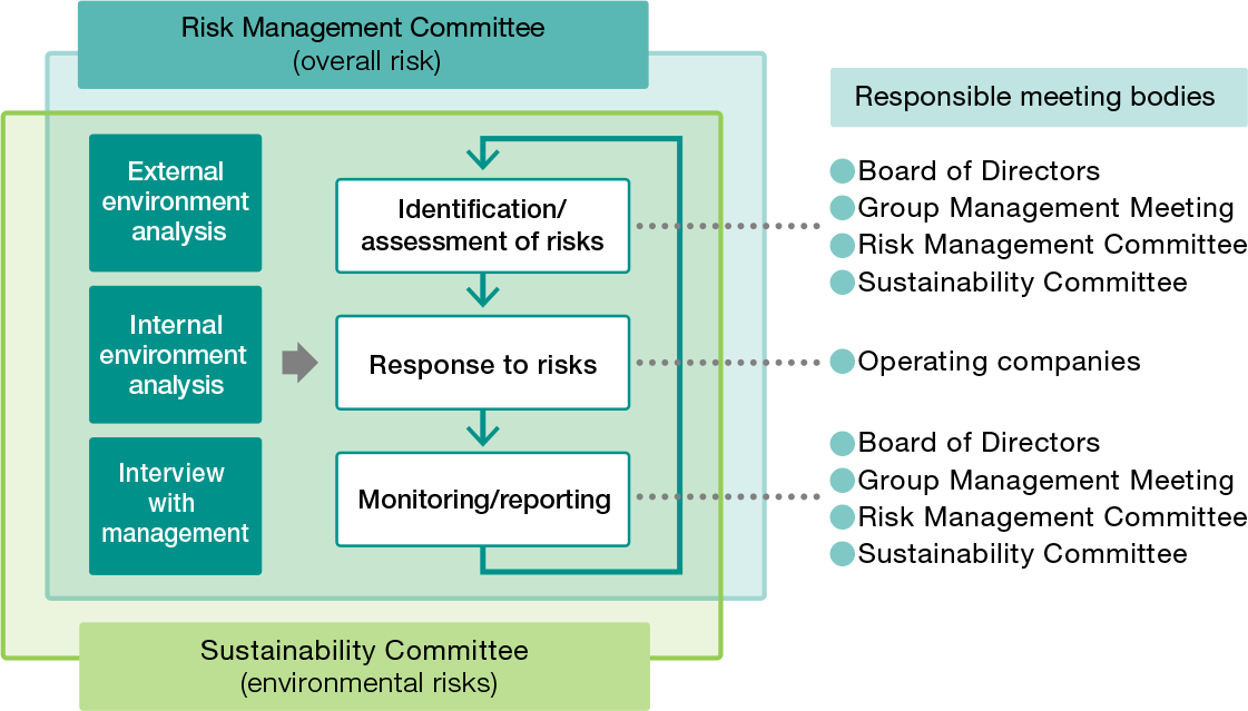 Recognizing that risk management is critically important to corporate management, we have established a Risk Management Committee (meets three times a year) to manage all risks, including environmental risks, in an integrated company-wide manner. The committee deliberates on important matters such as identification and evaluation of risks and the determination of which risks will be reflected in strategy. Because we position risk as the starting point of strategy, we strive to link risk management to the enhancement of corporate value by aligning our strategy with risk.