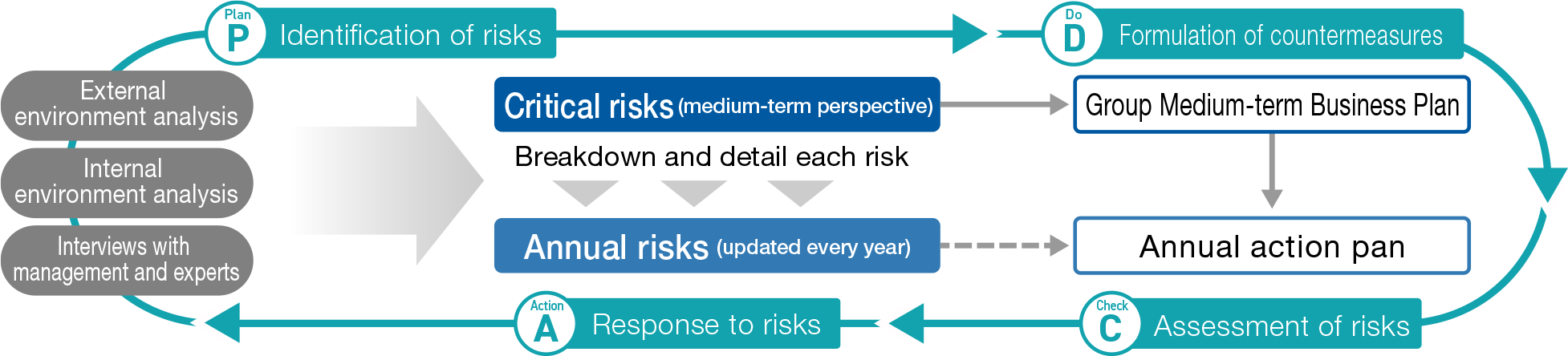 Risks that are extremely important to the Group's management over the medium term are positioned as "critical risks" and serve as the starting point for our Medium-term Business Plan. Significant risks are further broken down into "annual risks," allowing us to clarify the risks to be addressed each year and prioritize countermeasures. One of our key risks is the "growing importance of environmental issues," and we review environmental risks and opportunities on an annual basis.