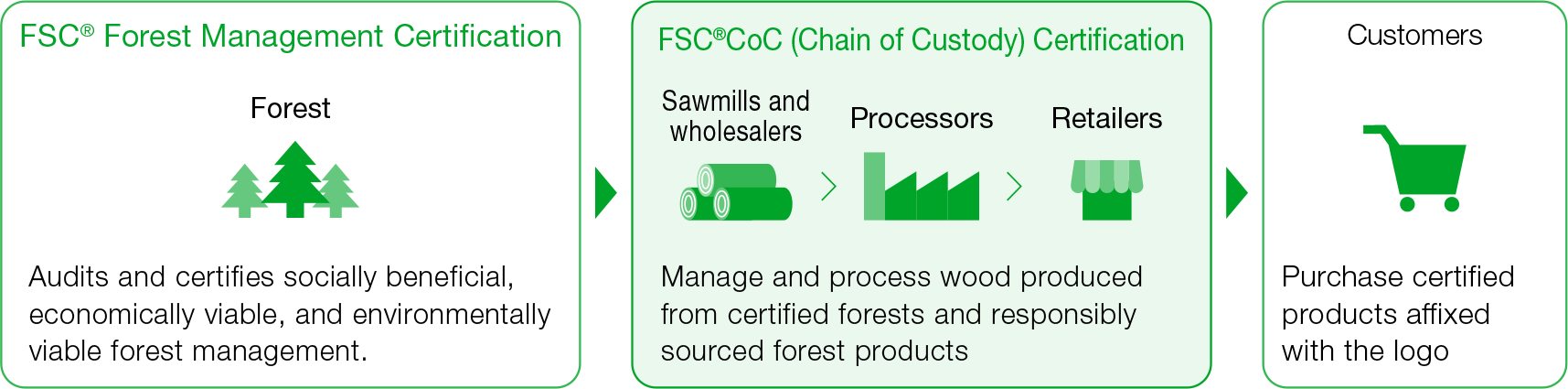 * Chain of Custody (CoC) certification guarantees the processing and distribution process of products made from FSC-certified wood until they reach the hands of consumers.
