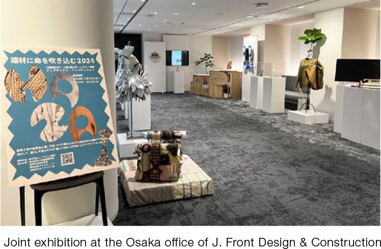 At J. Front Design & Construction, leftover material such as wood scraps and unusable film cutoffs have been generated during interior construction work and the production of film mirror and fixtures. To utilize these materials, we have partnered with Osaka University of Arts to hold the "Breathing New Life into Scrap Wood" project every year since 2022. Starting in 2023, the range of materials expanded, including stone and metal, thanks to sponsorship from supplier companies. From 2024, Osaka Institute of Technology also joined the initiative, making it a joint project in which students, applying their rich imagination and flexible design skills, created unique works by engaging with the irregular and intriguing qualities of scrap.
