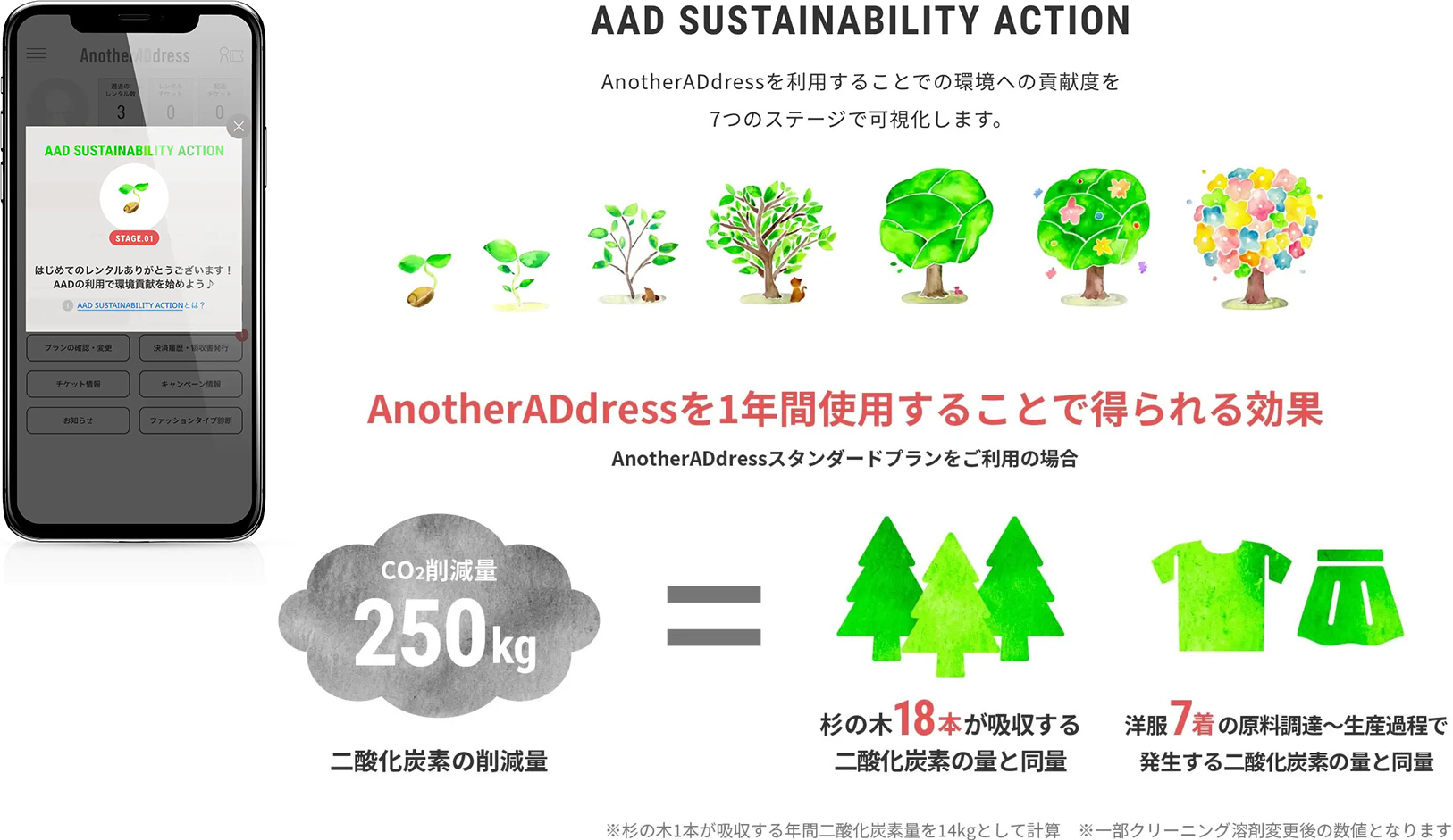 それを「AnotherADdressの環境貢献度」として7つのステージで可視化します。ファッションサブスクリプションで毎月自由にファッションを楽しむ中で自然とアクションポイントが貯まり、ステージごとにお客様の温室効果ガス削減貢献度がわかる“AAD SUSTAINABILITY ACTION”をスタートしました。