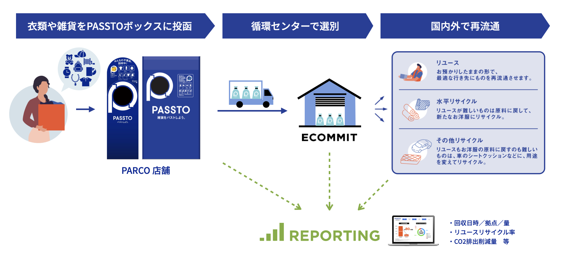 パルコは、2024年6月より順次、株式会社ECOMMITと、地域の廃棄物の削減資源循環への貢献を目的として、不要品の回収・選別・再流通を一気通貫で行うECOMMITのサービス 「PASSTO」を5店舗(吉祥寺・ひばりが丘・調布・ 錦糸町・福岡)に導入しました。