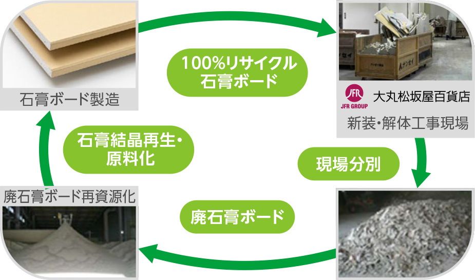 大丸松坂屋百貨店の内装工事においては、2025年度の松坂屋名古屋店の改装を皮切りに、①100%リサイクル石膏ボードの使用と、②解体工事で発生する廃石膏ボードを100%石膏ボードの再原料化が可能な工場へ搬入することで、石膏ボードの水平リサイクルに取り組んでいます。